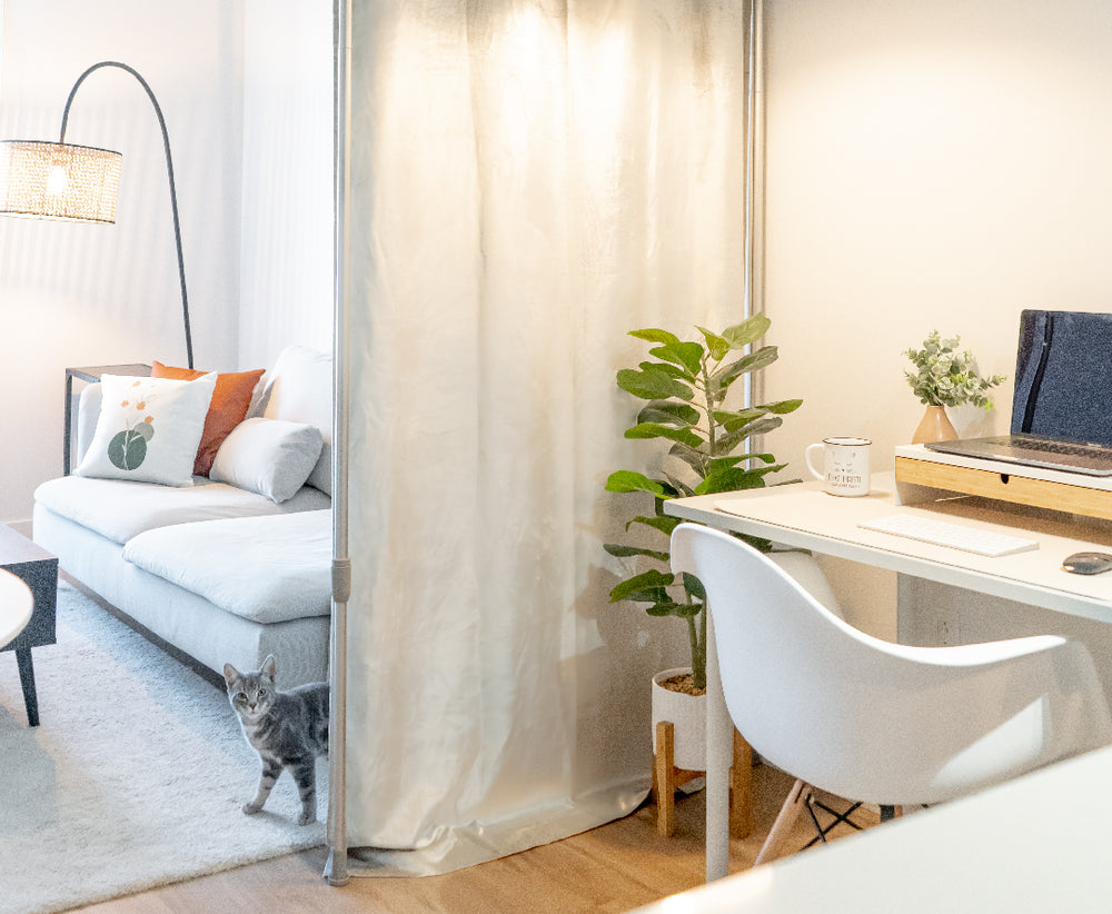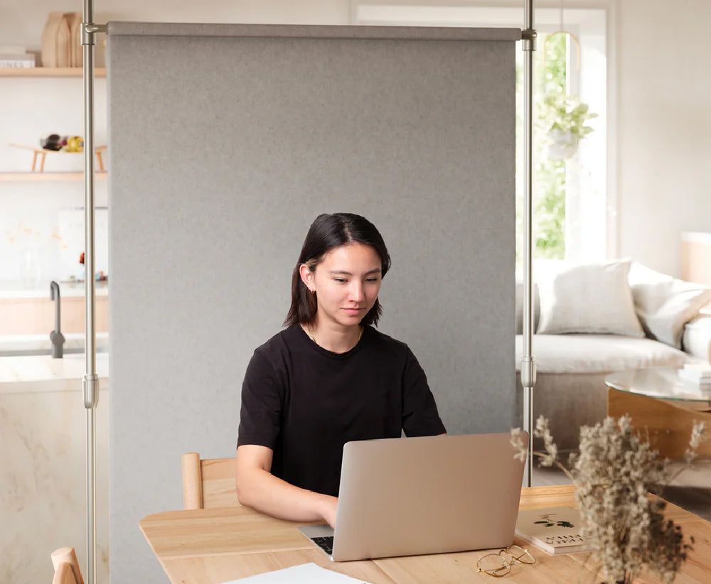 Obviously, it's not everyone's reality to have an intimate, professional & credible space when it comes to diving into the work-at-home world. Whether you live with your parents, with a roommate or in a smaller condo/apartment, we thought it might be interesting for you to know about our miracle product to remedy the situation: Umbra's Anywhere divider. TADAM-TSSS! 🥁