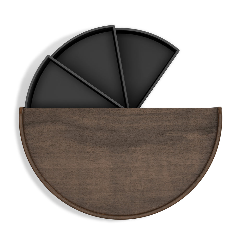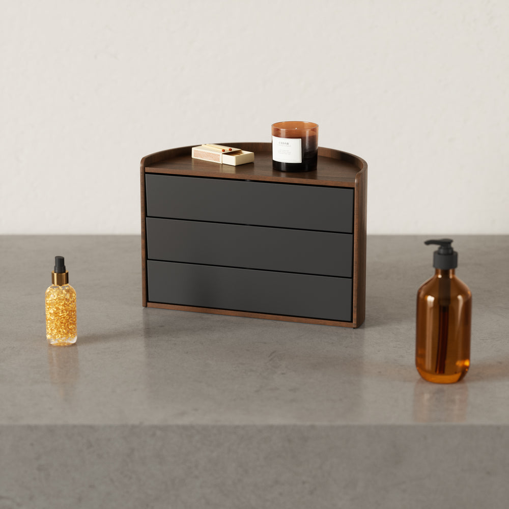 This case features round and circular shapes for a unique jewelry organizer. Both decorative and functional, it has a large display tray that doubles as a tray for small accessories, perfumes, small plants or other items. Its three rotating drawers can provide hidden storage or be pushed out for easy access.