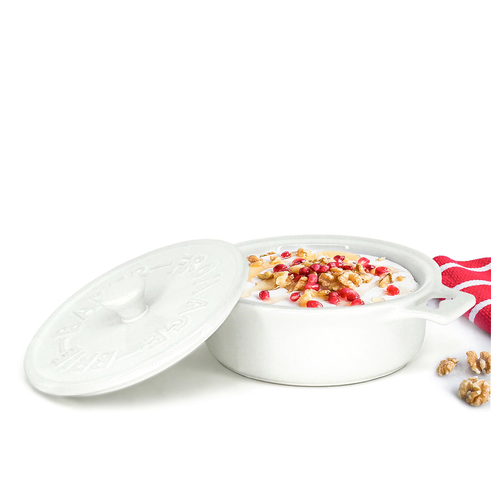 Cette cocotte à brie en grès blanc est idéale pour cuisiner et servir vos fromages préférés, tels que le brie, le camembert & même des trempettes chaudes. Sa conception pratique permet de passer facilement du four à la table grâce à ses poignées ergonomiques. Fabriquée en grès de haute qualité, cette cocotte est non seulement esthétique, mais aussi fonctionnelle, étant compatible avec le four, le micro-ondes et le lave-vaisselle.