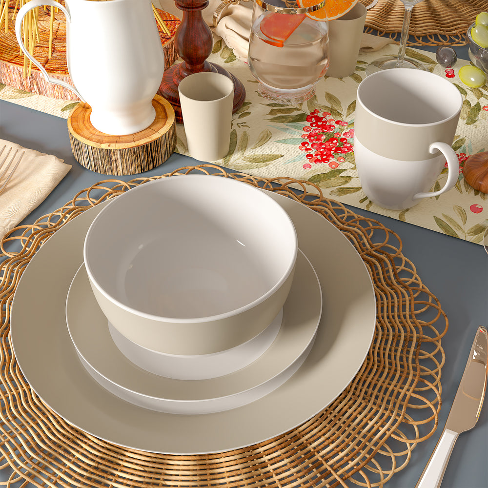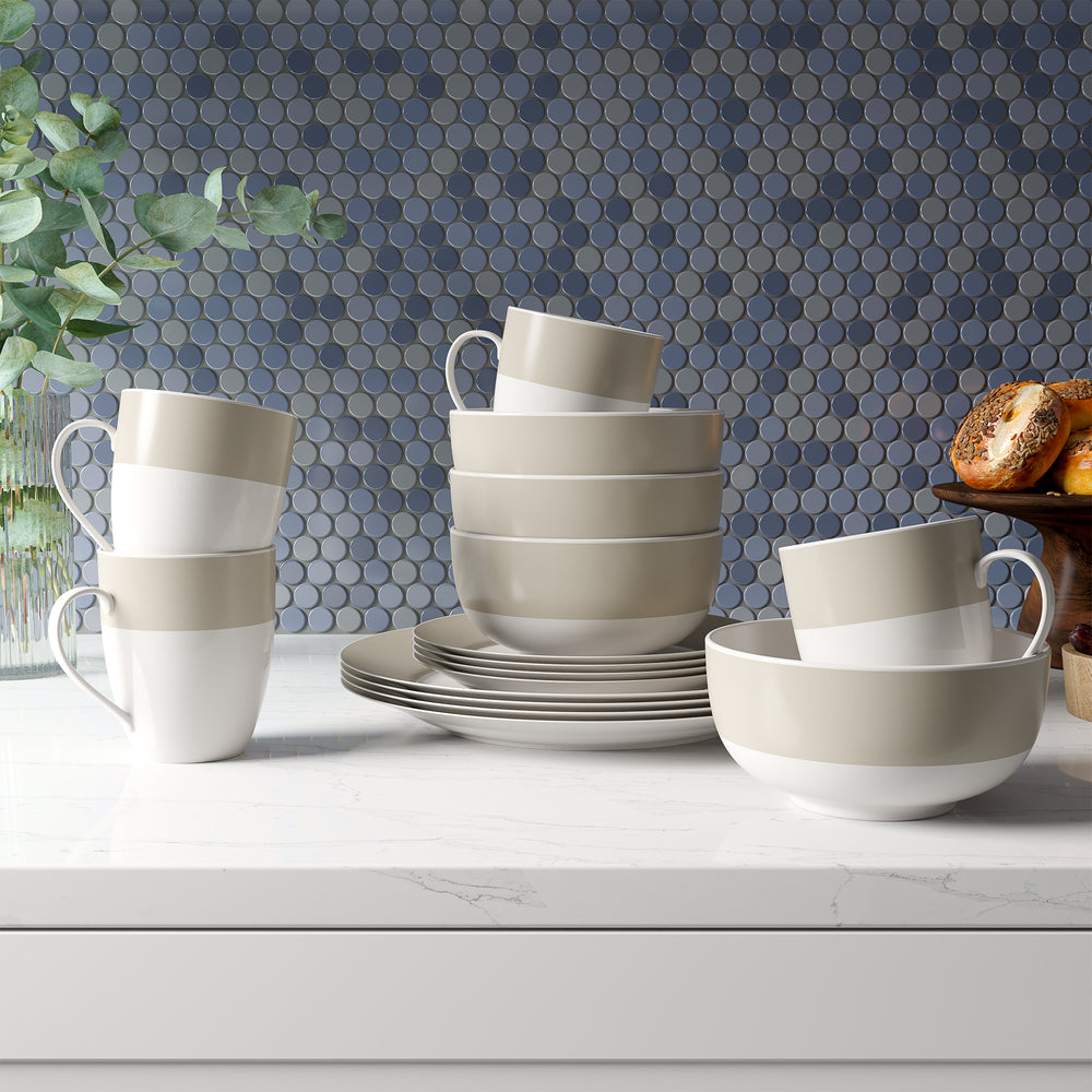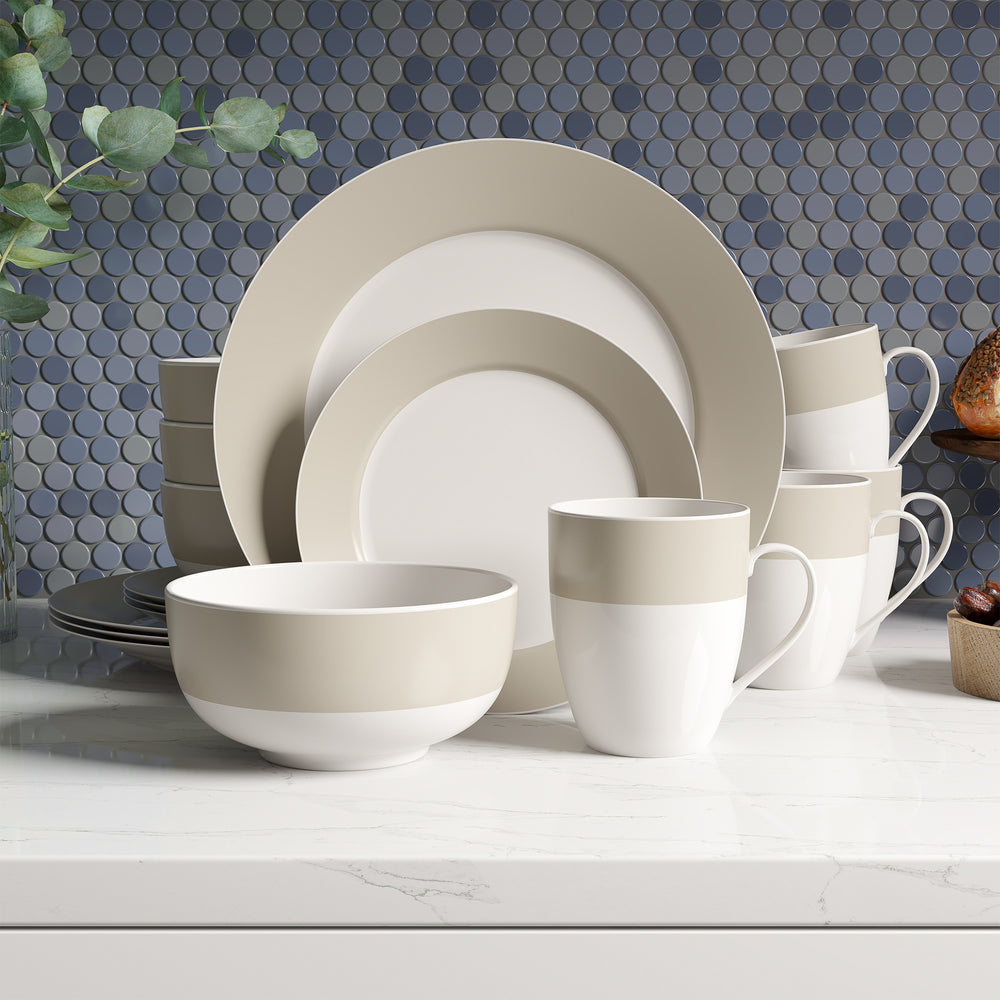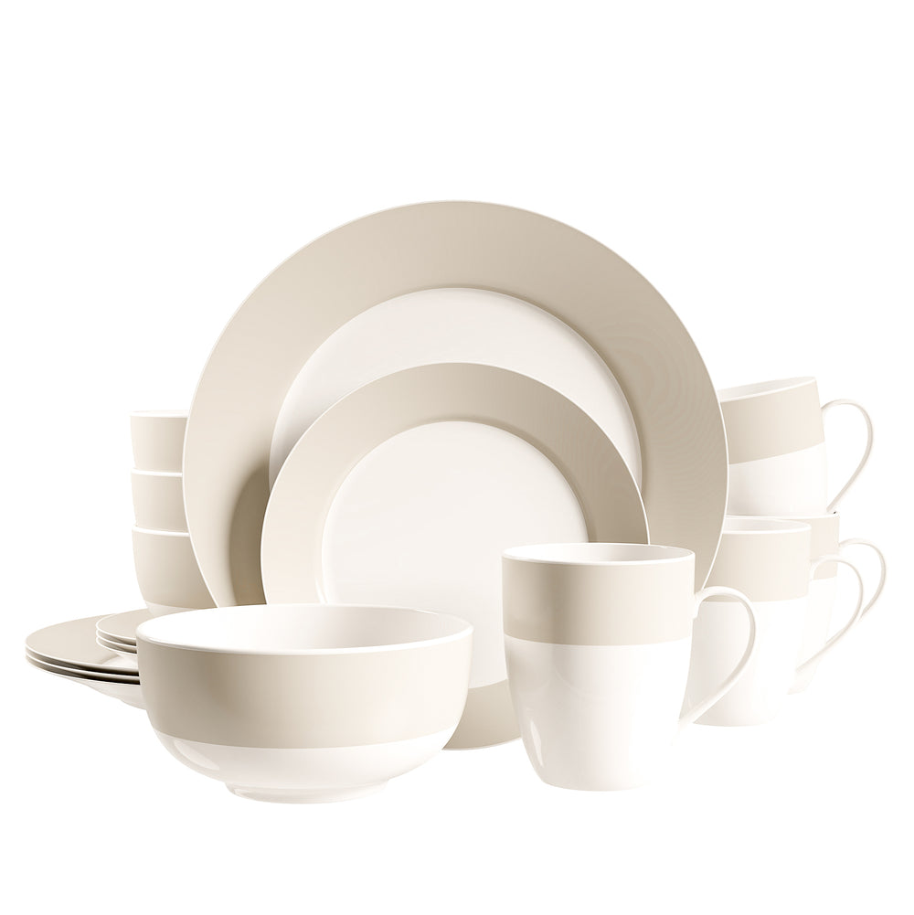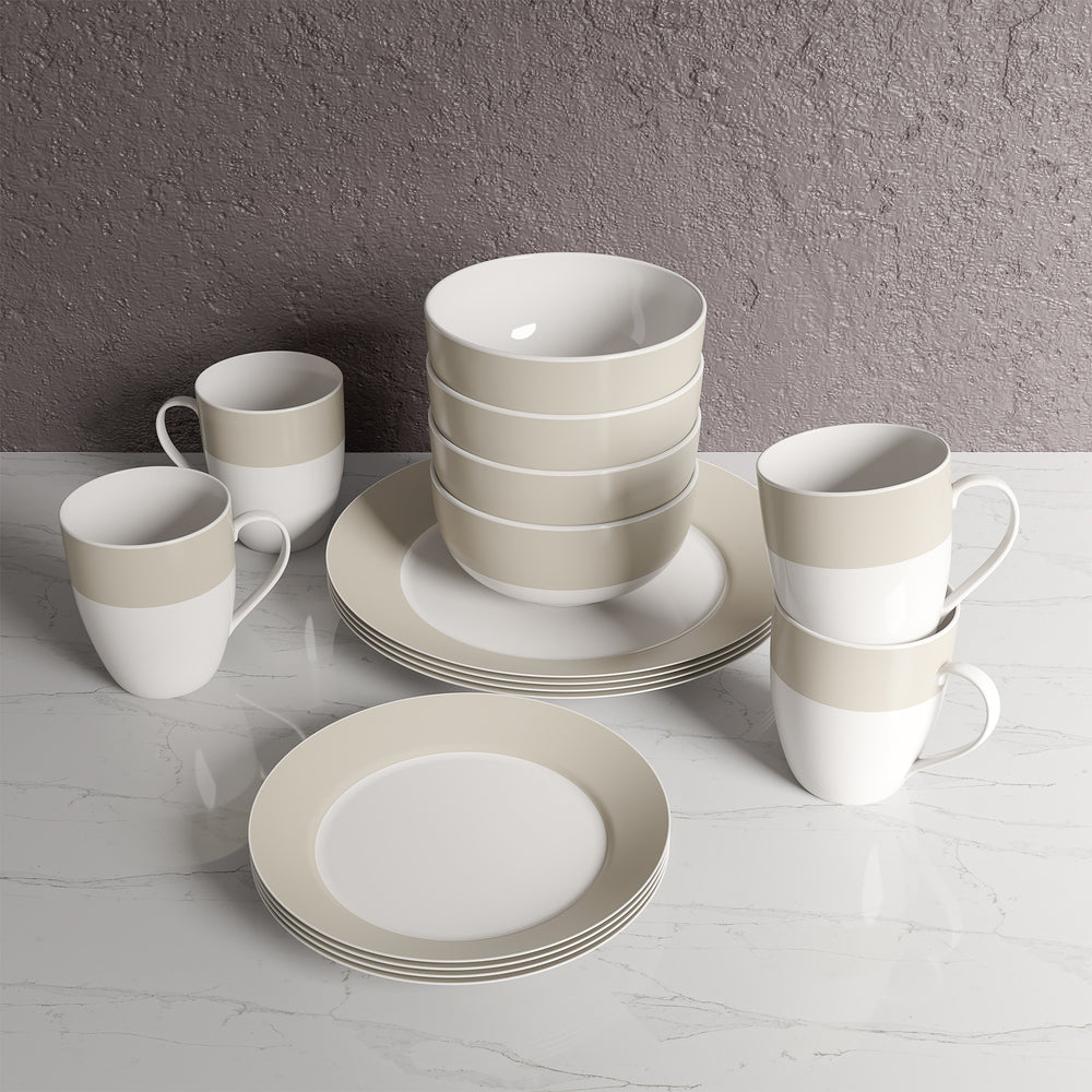Sa conception en porcelaine de haute qualité, à la fois légère et ultra-résistante, assure une durabilité remarquable pour une utilisation quotidienne. Le design se distingue par des bords ronds élégants et une bande taupe sophistiquée, conférant un look contemporain et minimaliste. L'ensemble comprend 16 pièces.