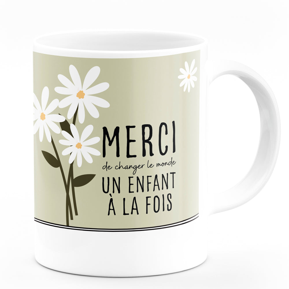 Montrez votre gratitude à un professeur ou une éducatrice formidable avec cette tasse unique ! Ornée de jolies marguerites et du message touchant "Merci de changer le monde un enfant à la fois", elle est le cadeau parfait pour leur rappeler l'impact positif de leur travail au quotidien. Idéale pour la fin de l'année scolaire, un départ, ou simplement pour dire merci.
